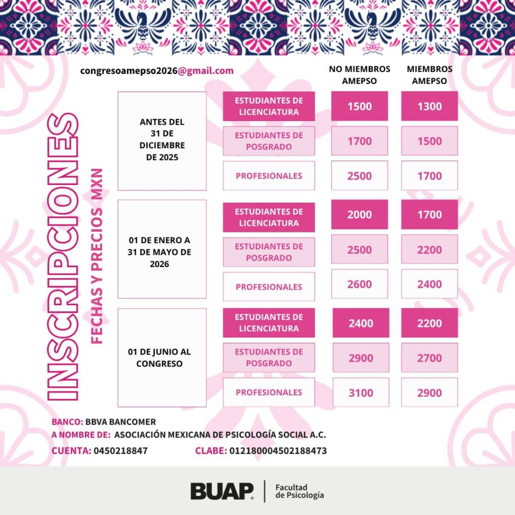 Con el objetivo de facilitar la participación de la comunidad académica y profesional, el XXI Congreso Mexicano de Psicología Social (AMEPSO 2026) ha establecido distintas modalidades y cuotas de inscripción, atendiendo a los perfiles de las y los participantes.